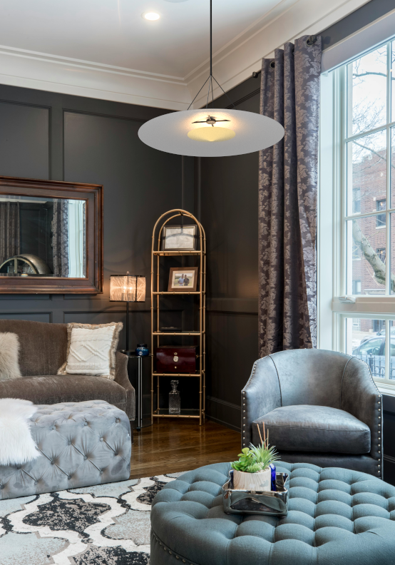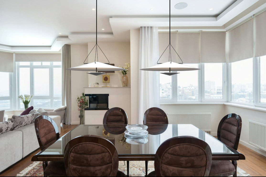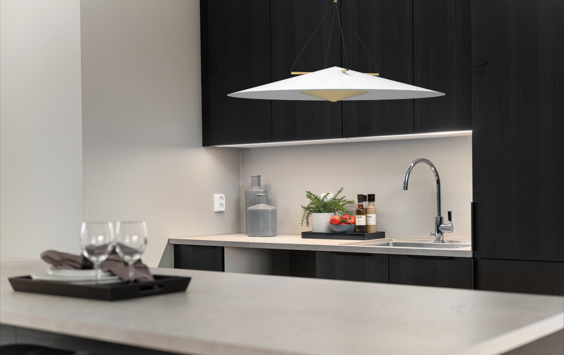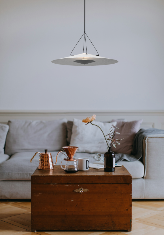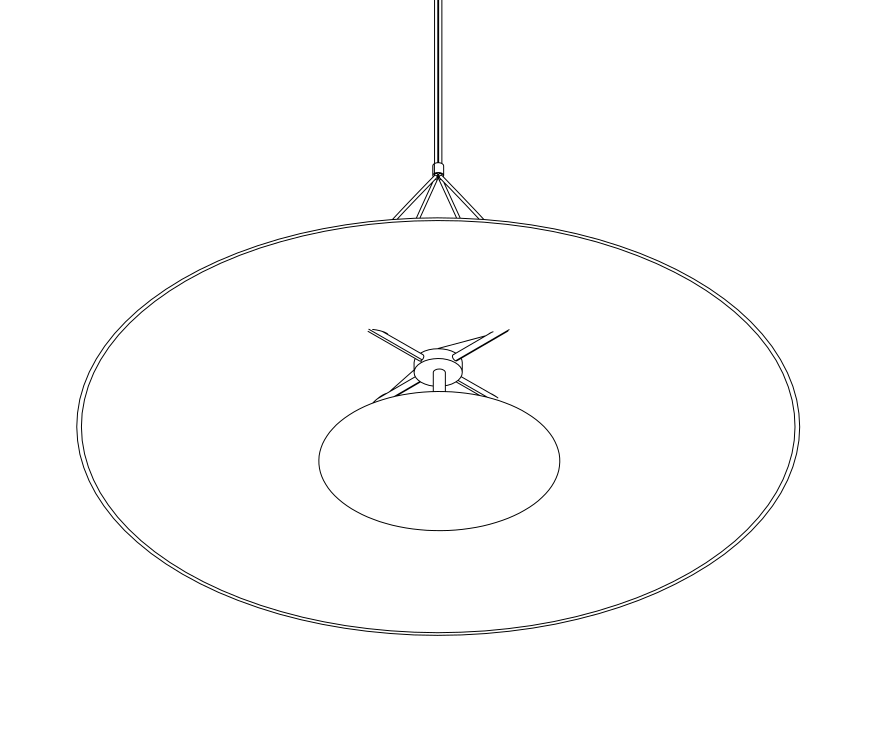 Lampada da arredo in policarbonato a deformazione termica, con sistema a sospensione ad aquilone con regolazione ampiezza cavi